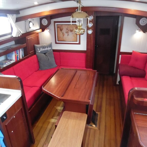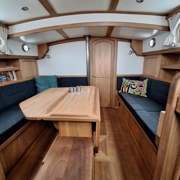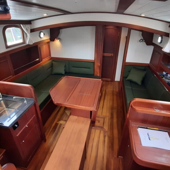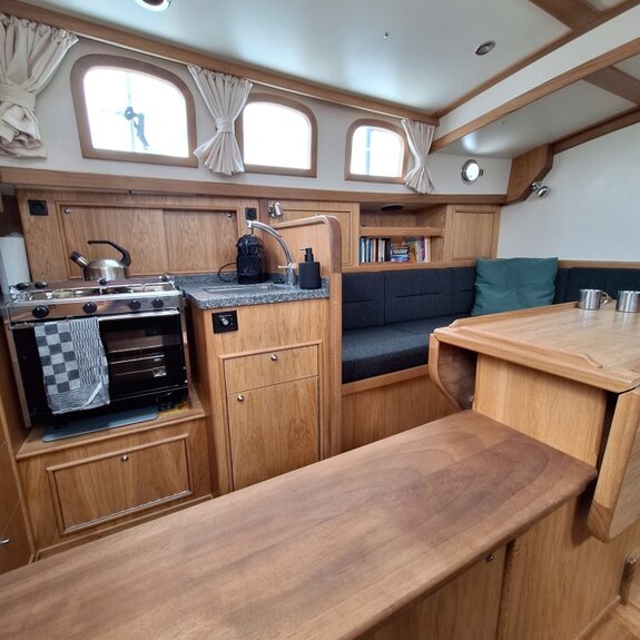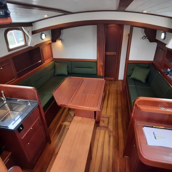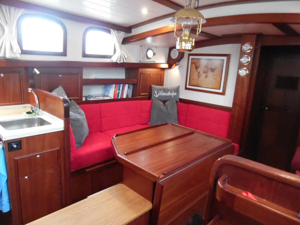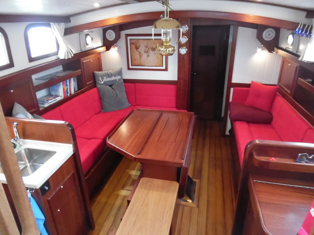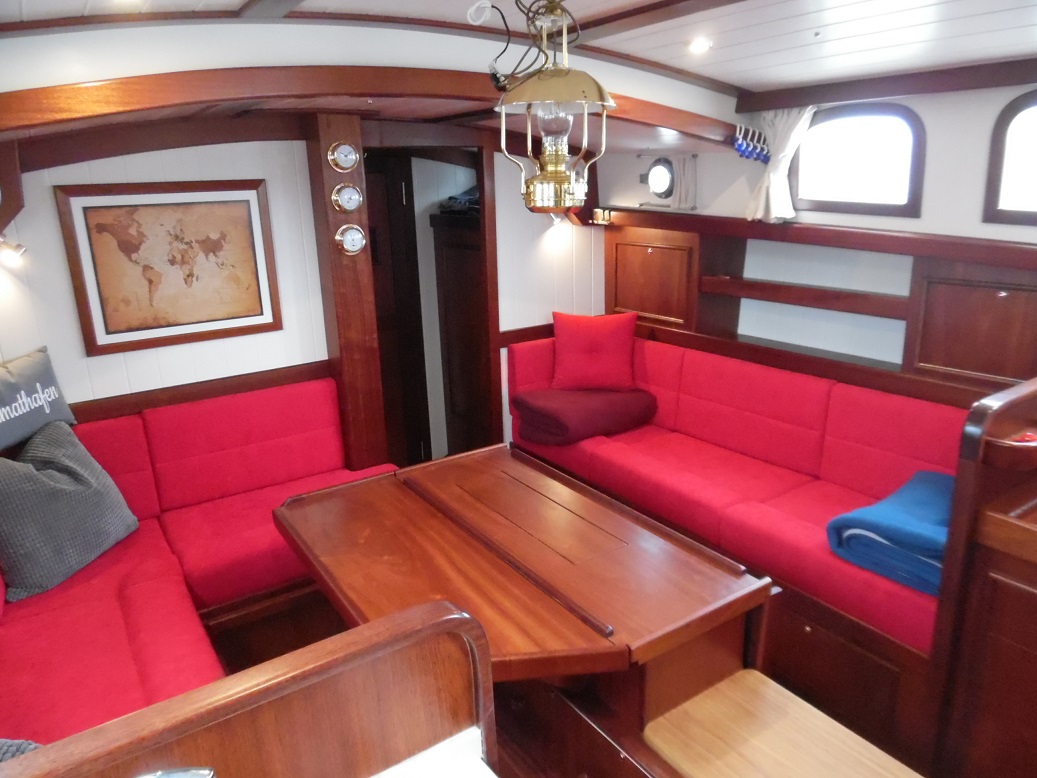 Die Takelage ist wahlweise klassisch mit Rundholmen und Gaffelsegel oder modern mit Aluminium-Tornetakelage und Rollvorsegel, Sloop- oder Kuttertakelung.