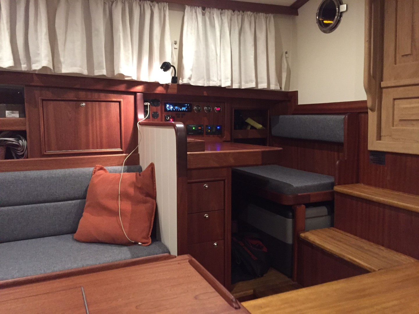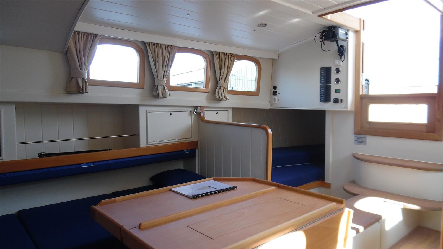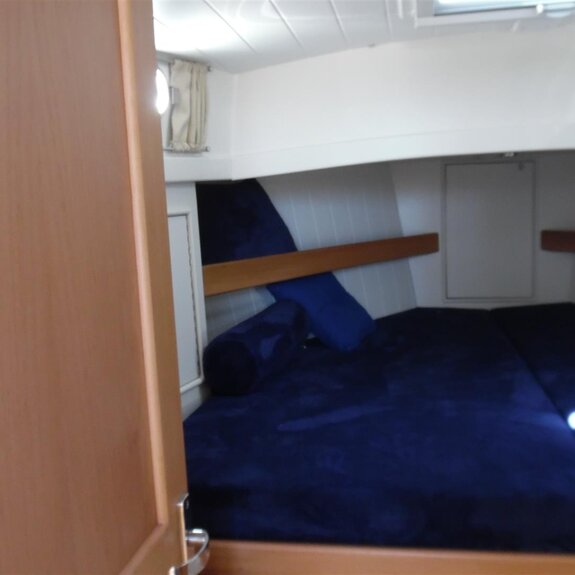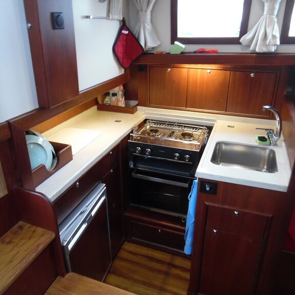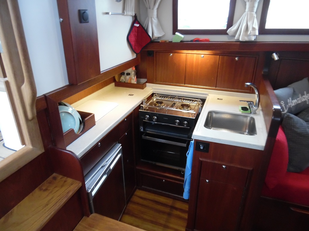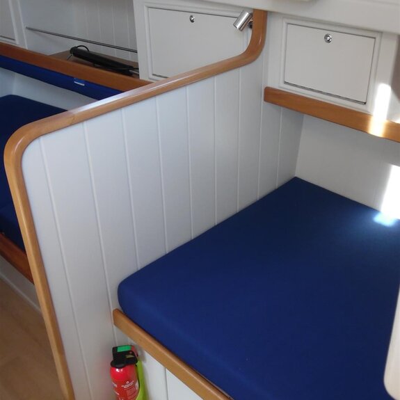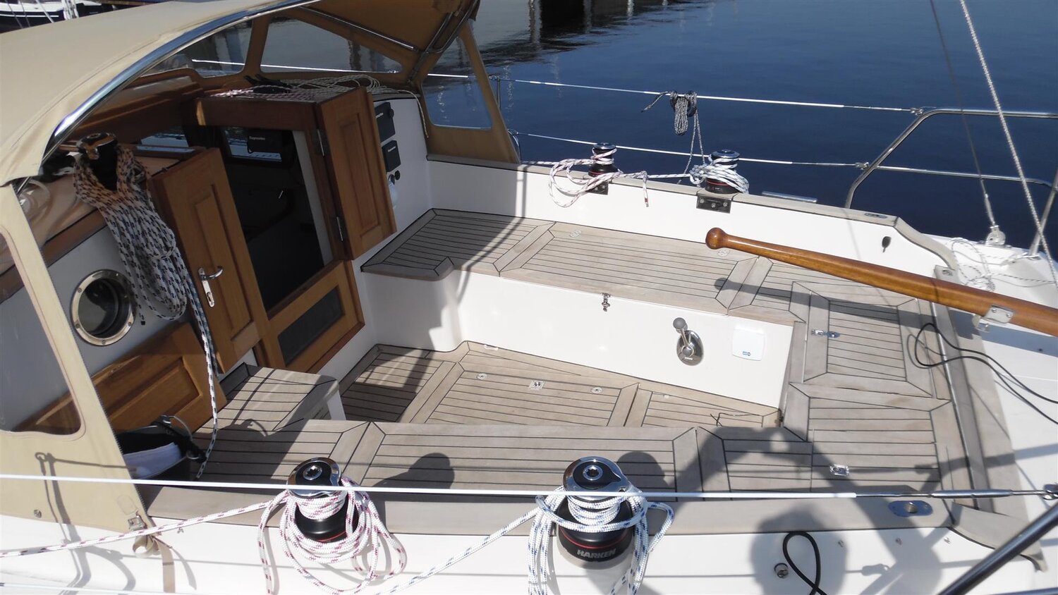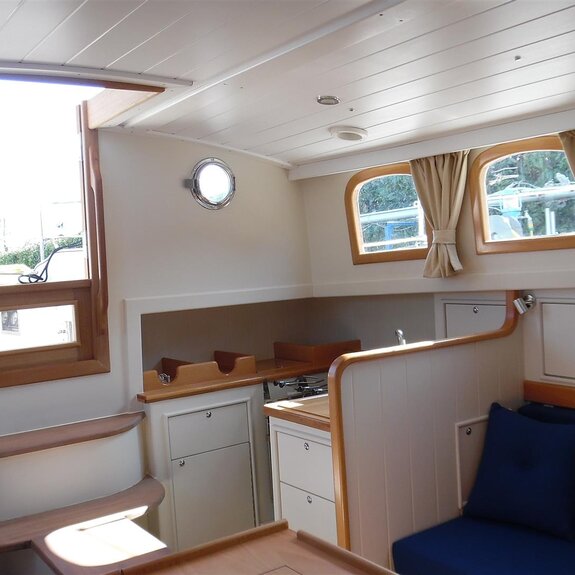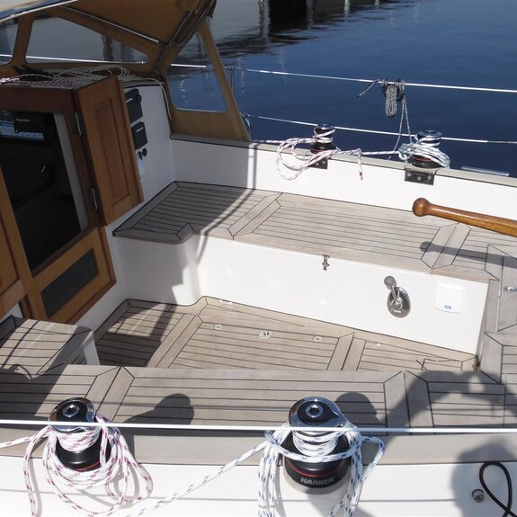 auf längeren Reisen reicht ein Staukasten kaum aus, ein Hundekäfig ist natürlich weiterhin möglich. - Das Focksegel des kottergetakelten Bootes ist als Rollfock ausgeführt: eine Schot, gebogene Schotleiste, Bedienung auf dem Kajütdach.